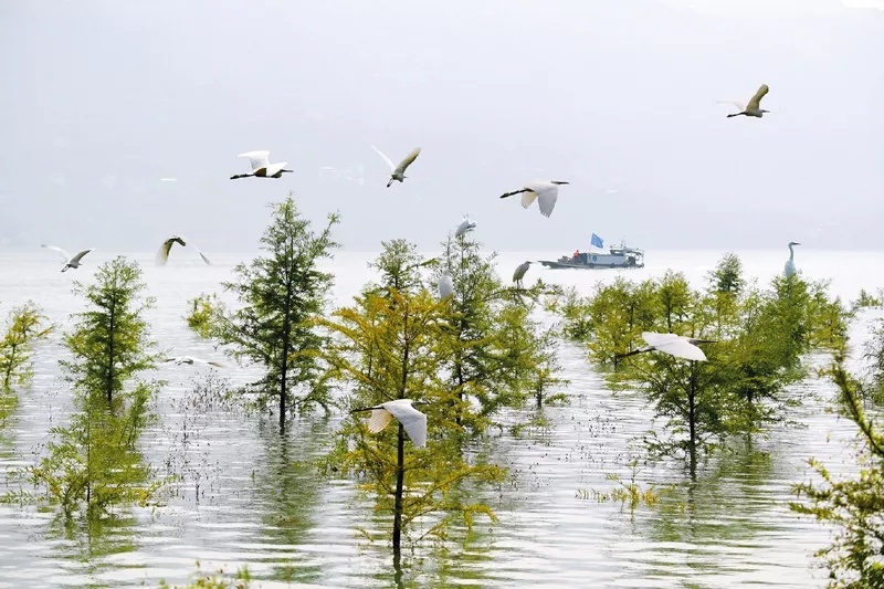 人民法院認(rèn)真貫徹落實(shí)習(xí)近平生態(tài)文明思想,努力為生態(tài)文明建設(shè)與綠色發(fā)展提供優(yōu)質(zhì)司法服務(wù)。在長江三峽庫區(qū),為解決庫區(qū)消落帶植物存活的治理難題,重慶法院引進(jìn)了耐淹耐旱的中山杉。圖為重慶法院長江三峽庫區(qū)生態(tài)修復(fù)司法保護(hù)示范林的中山杉在水庫蓄水時(shí)被部分淹沒的景象。最高人民法院供圖